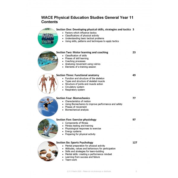 Teachers guides are packed with additional curriculum specific content to assist teachers in delivering the WACE General Year 11 curriculum. Many WACE General Year 11 activities are scaffolded with prompts which direct students and teachers towards subject specific content and also encourage effective short answer writing structure. Our resources are packed full of graphics catering to pictorial learners and re-written every year specifically for the WACE Physical Education Studies General Year 11 curriculum. Printed in Black and White with plasticoil binding. Because we 'print to order', a $10.00 surcharge applies on all books ordered after December 1. ISBN: 978-0-9870832-6-5. Pagnation: 170 pages.